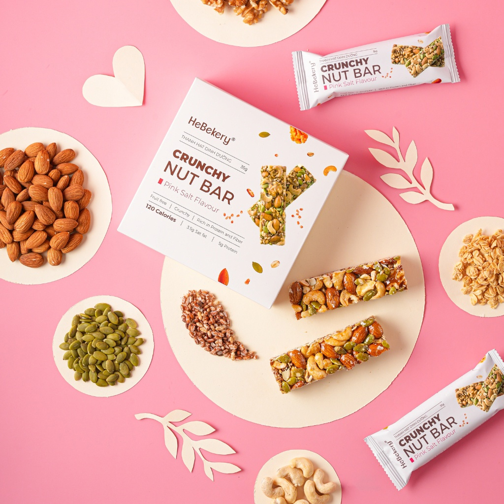 Thanh hạt dinh dưỡng với nguyên liệu chính là các loại hạt nguyên chất như hạnh nhân, hạt điều, hạt bí xanh… kết hợp với muối hồng giúp cung cấp năng lượng cho chị em trước khi tập hay khi làm việc chốn văn phòng.